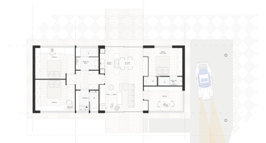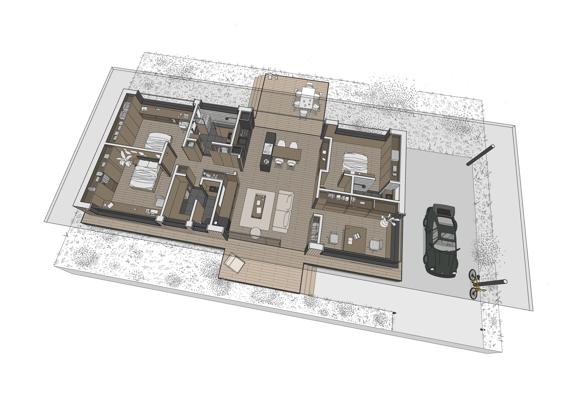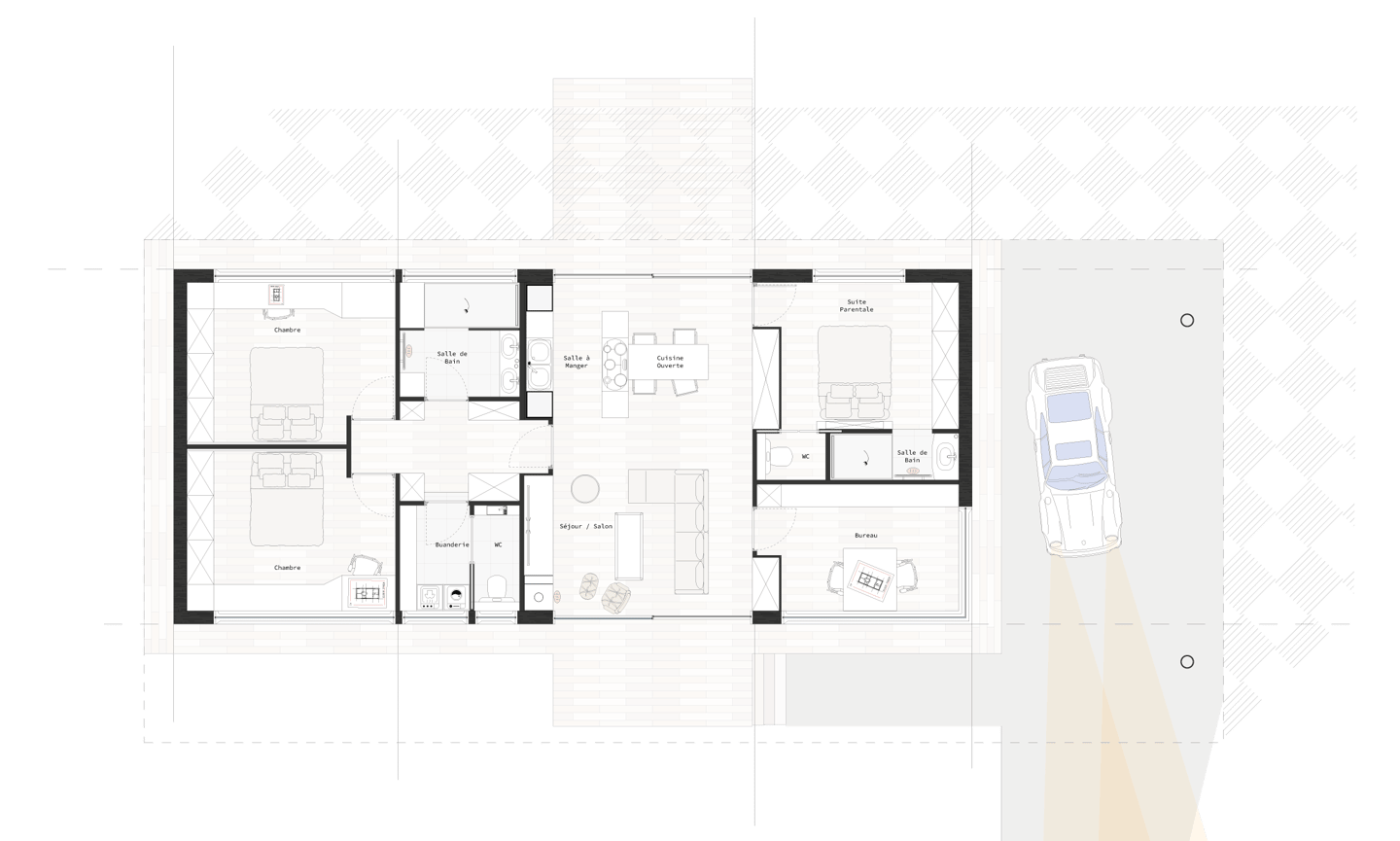 Nous avons réalisé les plans de conception d'une maison individuelle, à l'image des maisons traditionnelles japonaises. Nous avons ainsi réfléchi, en fonction des spécificités du terrain et du PLU, à la mise en place d'éléments adaptés (orientation, terrasses, mise en place de systèmes de chauffage et d'eau chaude spécifiques) permettant de maximiser l'efficacité de ce bien. Cette maison de 146 m2 dispose de 3 grandes chambres dont une suite parentale avec salle de douche et toilettes intégrés. L'espace de vie se compose d'une cuisine ouverte sur un séjour/salon de plus de 40 m2. Cette maison comporte également un bureau pouvant devenir une 4ème chambre, ainsi que d'une salle de bain, d'une buanderie, et de toilettes séparées.