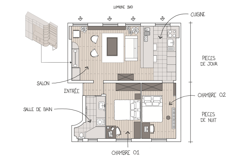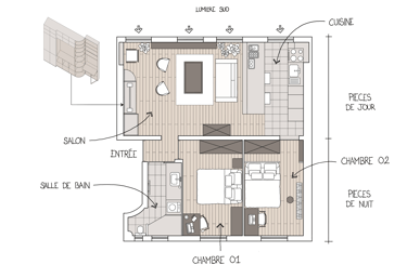 Nous avons donc totalement repensé la disposition de l'appartement, afin de créer deux grandes chambres séparées et isolées, tout en conservant un vaste espace séjour/salle à manger donnant sur une cuisine ouverte de plus de 32 m2.